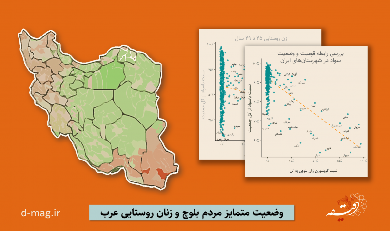 در مورد گویشوران بلوچ این وضعیت کاملا برعکس است و رابطه منفی بین سهم آنها از کل جمعیت و وضعیت سواد در شهرستان، بیشتر از سایر موارد دیده میشود. این رابطه با شدت کمتر، در مورد زن روستایی کرد، ترک، لر و عرب و همینطور زن شهری کرد و عرب مشاهده میشود. در میان مردان شهری غیر از مرد بلوچ رابطه معنادار منفی دیگری با وضعیت کلی سواد در شهرستانها دیده نمیشود. به بیان سادهتر، در میان مردان شهرنشین وضعیت سواد مردان بلوچ به طور متوسط از مردان دیگر پایینتر است. در وضعیت سوادِ دیگر مردان شهرنشین، تفاوتِ معنادارِ منفیِ دیگری میان اقوام مشاهده نمیشود. در میان مردان روستایی، علاوه بر مرد بلوچ، رابطه منفی معنادار در مورد مرد لر، کرد و ترک نیز با شدت کمتر قابل مشاهده است.
