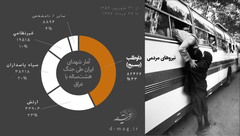 نگاهی کلی به آمار شهدا نشان میدهد که سهم نیروهای دواطلب در میان شهدا بسیار قابل توجه است. تقریبا از هر دو شهید در میان رزمندگان ایران، یک نفر متعلق به بسیج نیروهای مردمی و داوطلب بوده است.