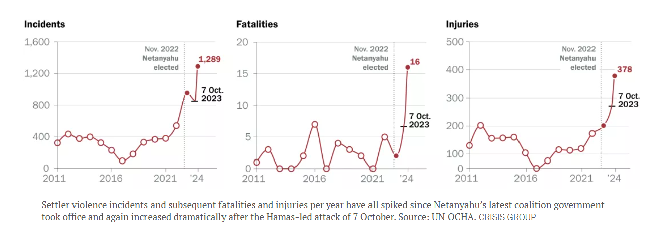 گزارش‌ دیگری از گروه بین‌المللی بحران نشان می‌دهند گسترش شهرک‌نشینی و بروز خشونت از جانب شهرک‌نشینان اگرچه پس از ۷ اکتبر به صورت بی‌سابقه‌ای شدت گرفته اما پیش از آن نیز هم‌زمان با نخست‌ویزی بنیامین نتنیاهو مخصوصا با شروع دور جدید آن از دسامبر ۲۰۲۲ (دی ۱۴۰۱) روندی فزاینده داشته است (+).