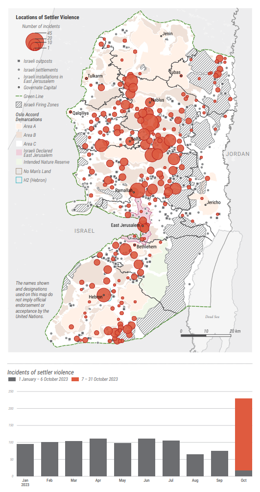 در سال‌های اخیر گزارش‌های زیادی درباره افزایش خشونت شهرک‌نشین‌های اسرائیلی در سرزمین‌های فلسطینی منتشر شده است. به عنوان نمونه دفتر حقوق بشر سازمان ملل در گزارشی در سال ۲۰۲۴، از افزایش شدید خشونت شهرک‌نشینان اسرائیلی علیه فلسطینیان، تخریب خانه‌های ایشان و ساخت جاده‌های اختصاصی و دیوارهای حائل خبر می‌دهد و تاکید می‌کند که این اقدامات می‌تواند مقدمه انتقال کامل قدرت باشد و به الحاق کامل کرانه باختری به اسرائیل منجر شود و جامعه بین‌المللی را به دلیل عدم اقدام کافی برای تضمین رعایت تعهدات بین‌المللی اسرائیل مورد انتقاد قرار می‌دهد (+).