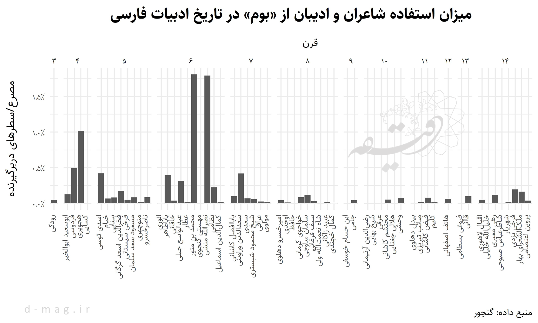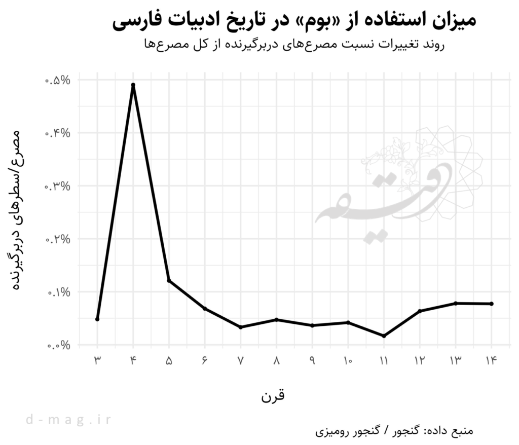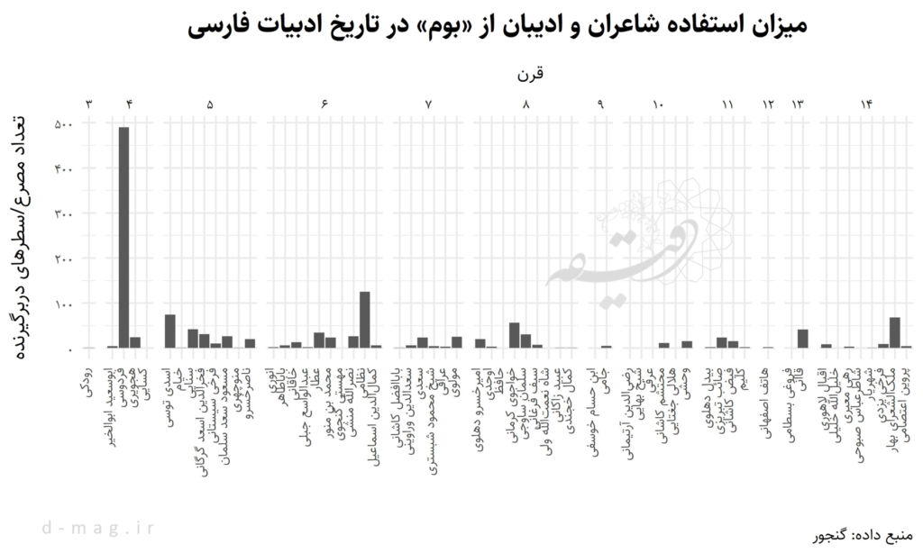 میزان استفاده از واژه «بوم» نیز شبیه به واژه «ایران»، بیش از هر چیز تحت تاثیر ادبیات قرن چهارم است و از نظر روند تاریخی تغییرات الگویی شبیه آن دارد. این الگو را کم‌وبیش در مورد «شهر» و «کشور» نیز می‌توان مشاهده کرد. به عبارت دیگر «ایران»، «بوم»، «شهر» و «کشور» واژگانی هستند که در قرون مختلف، هیچ‌گاه مانند قرن چهارم در ادبیات فارسی سهم نداشته‌اند که خود نشان از ویژگی‌های مهم و منحصر به فردِ این دوره در تاریخ ایران دارد (برای اطلاعات بیشتر نگاه کنید به «درخشان‌ترین دوره تاریخ ایران» از سال ۳۵۰ تا ۵۰۰ هجری‌قمری، اکبر ثبوت، چشم انداز ایران، ۱۴۰۴)