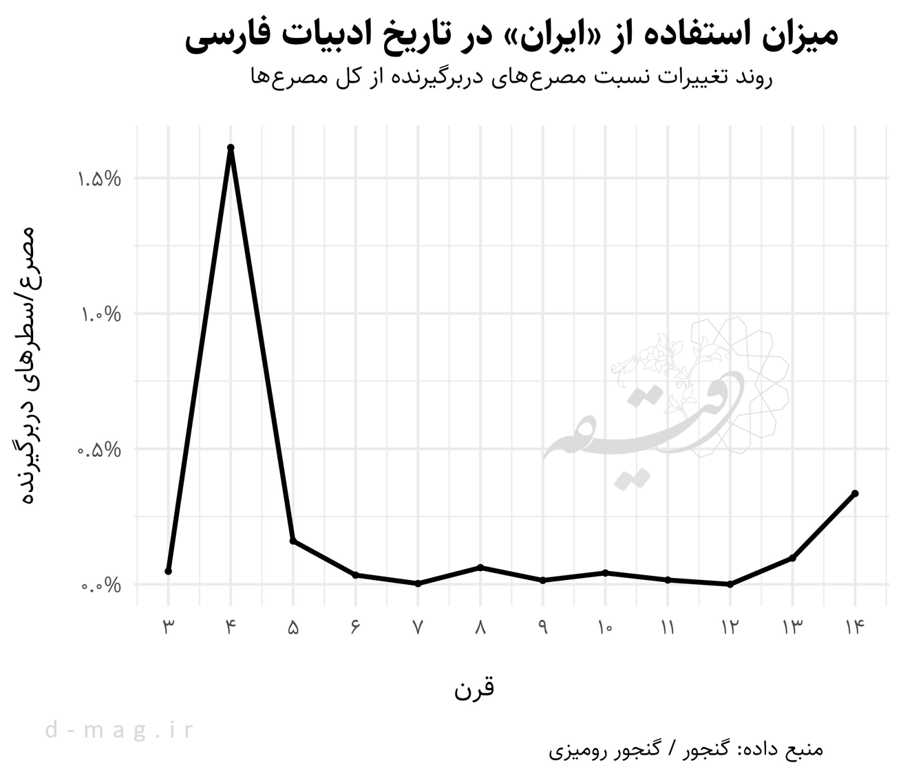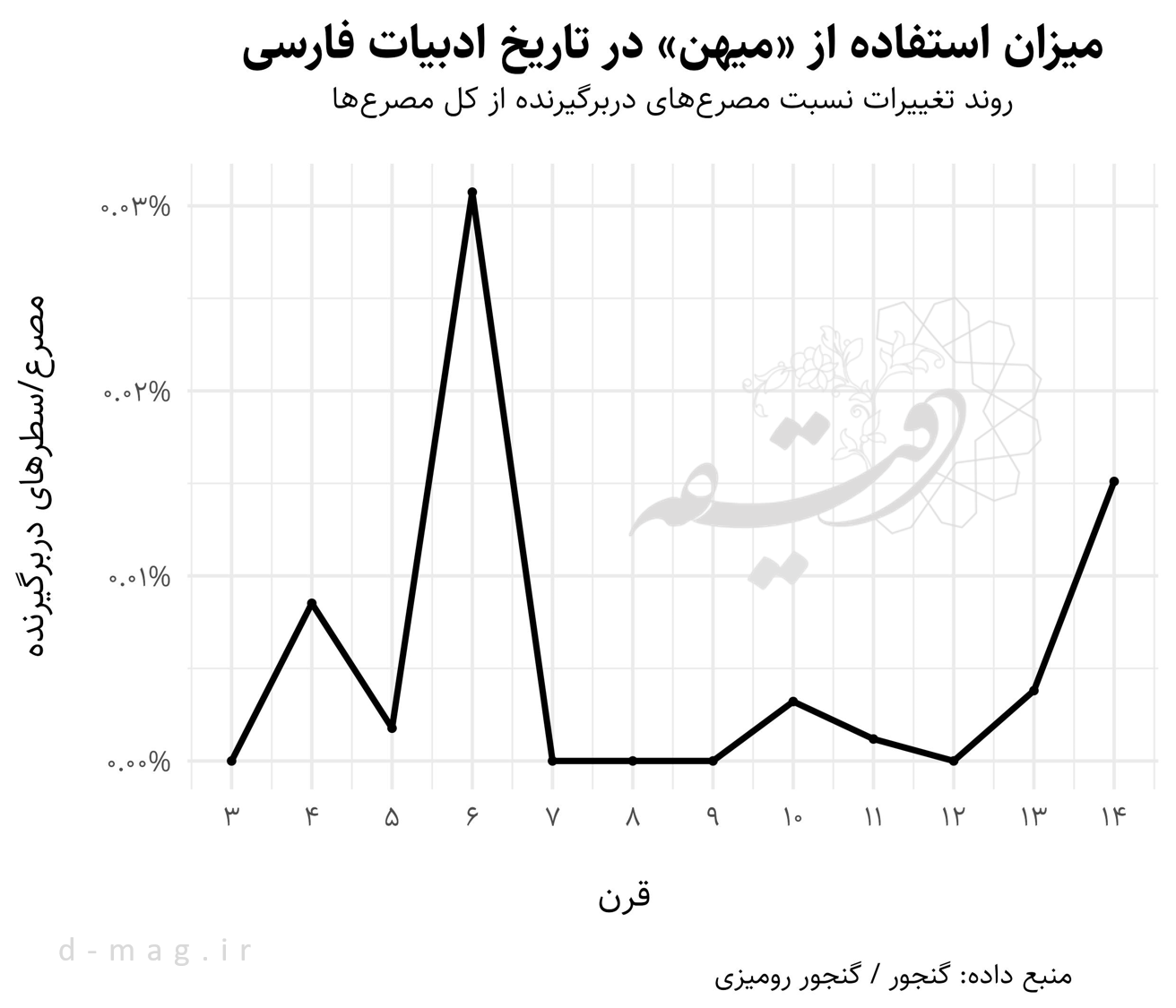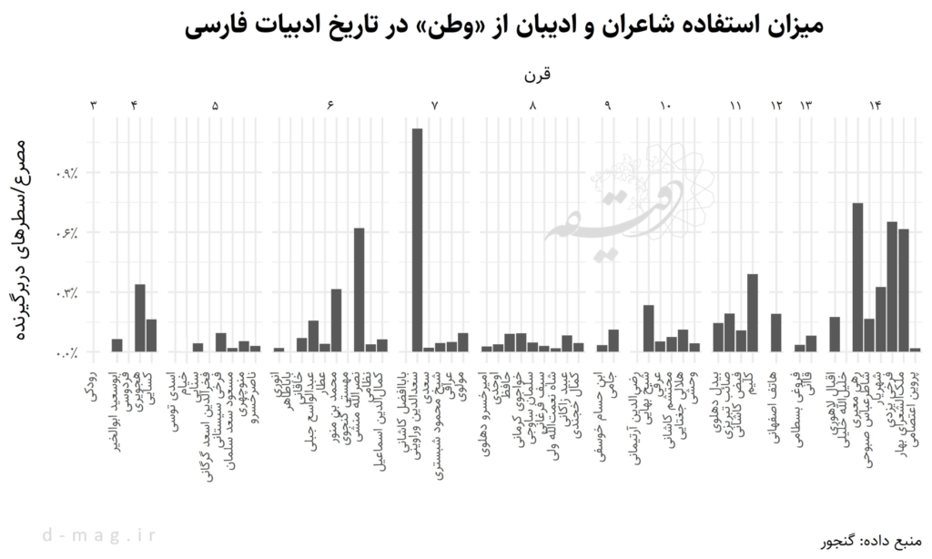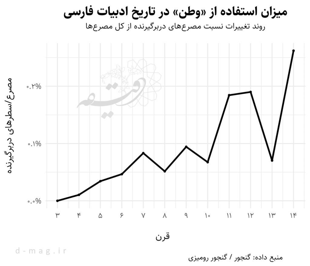سهم مصرع‌ها و سطرهای دربرگیرنده واژه «وطن» از کل مصرع‌ها و سطرها از قرن چهارم تا قرن دوازدهم همواره روندی تقریبا رو به رشد داشته و به نزدیک ۰.۱۹% می‌رسد و در قرن سیزدهم به‌یکباره به ۰.۰۷% کاهش می‌یابد، اما در قرن چهاردم وطن به فریاد در می‌آید و میزان استفاده از آن در ادبیات به مقدار بی‌سابقه ۰.۲۶% افزایش می‌یابد.