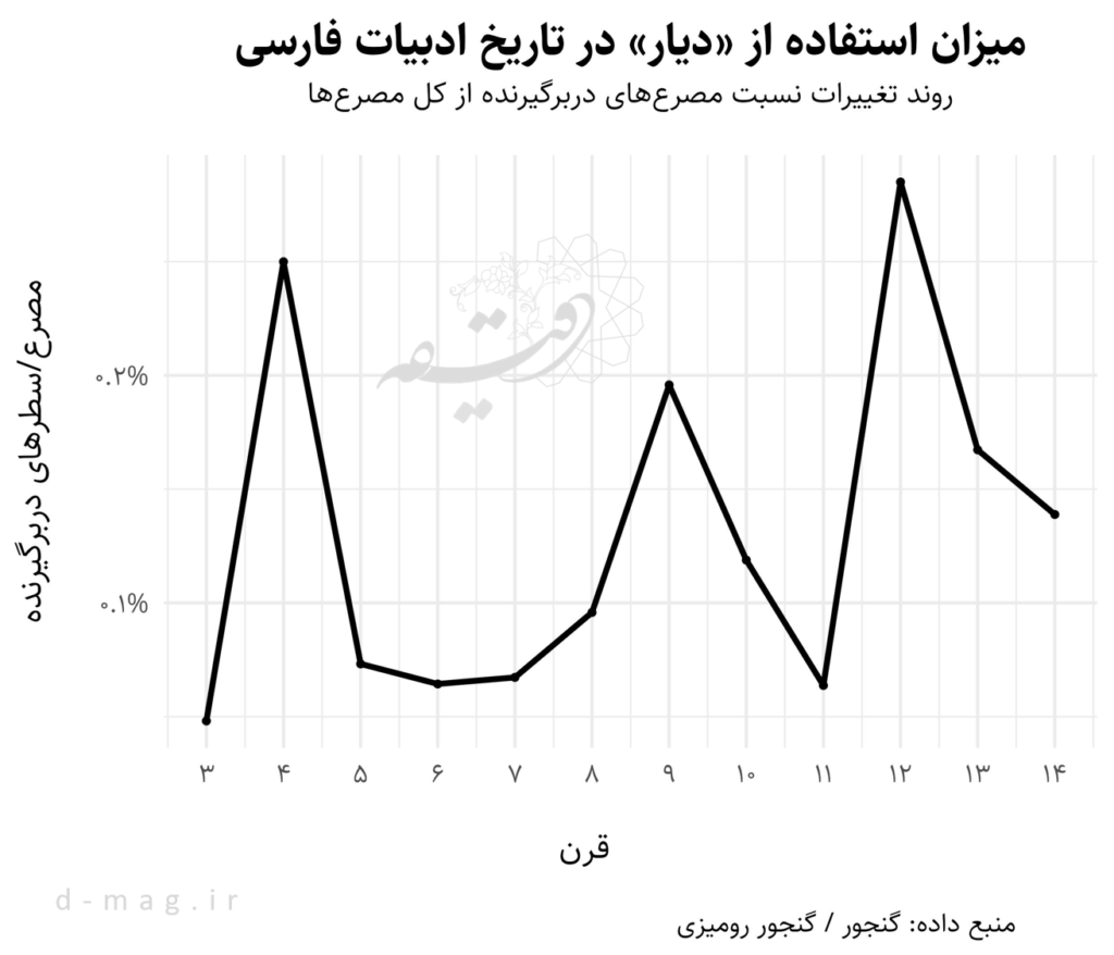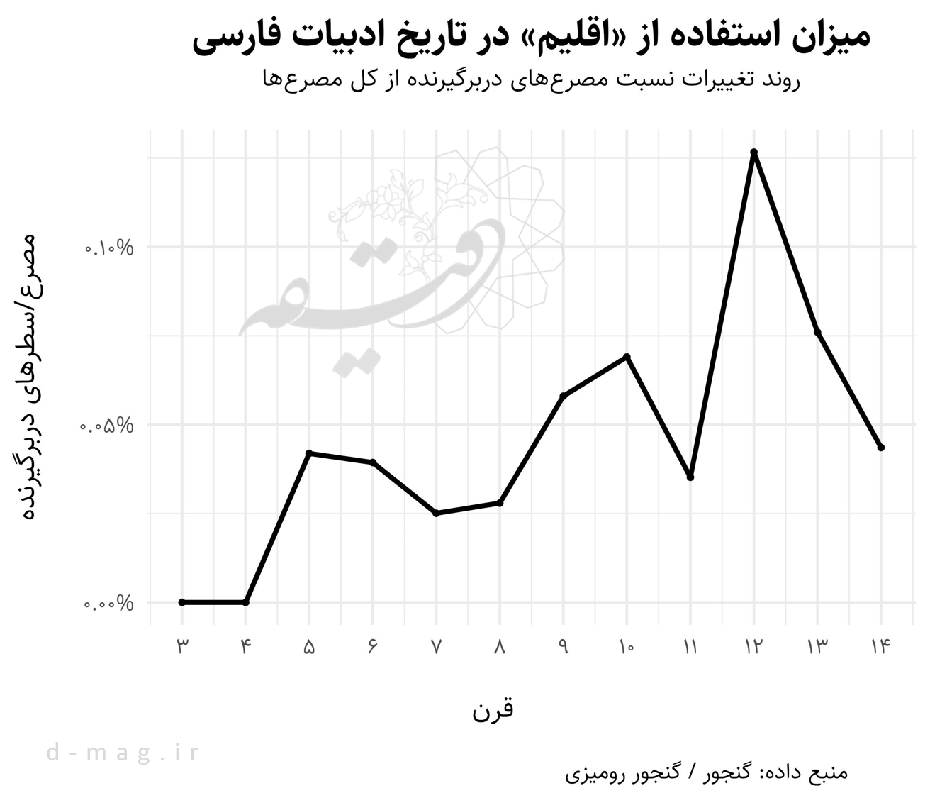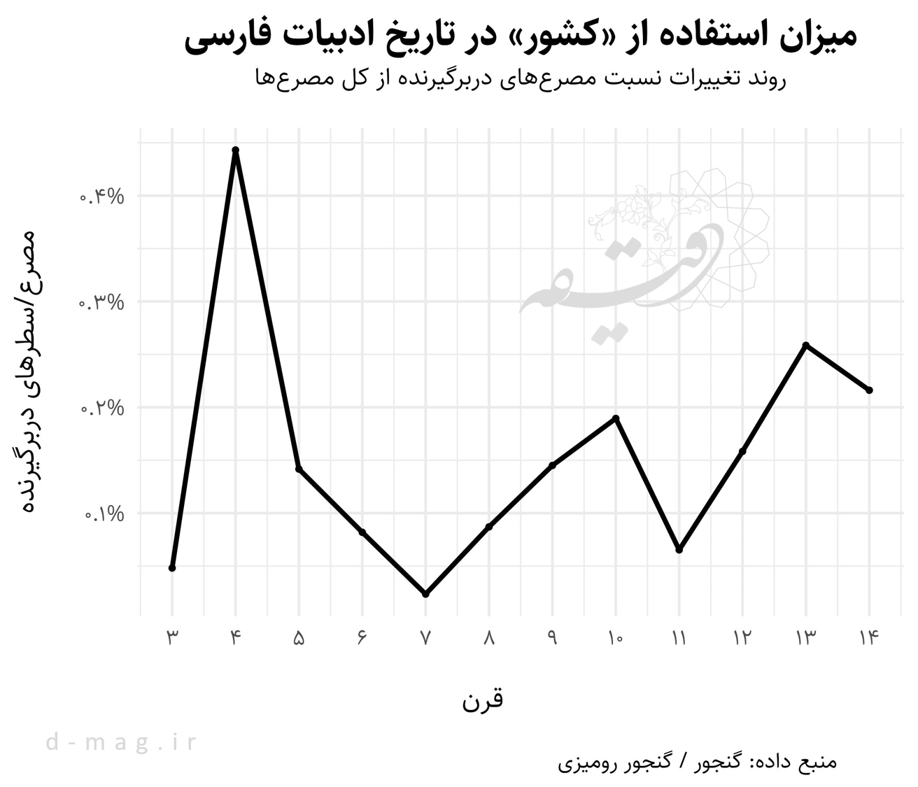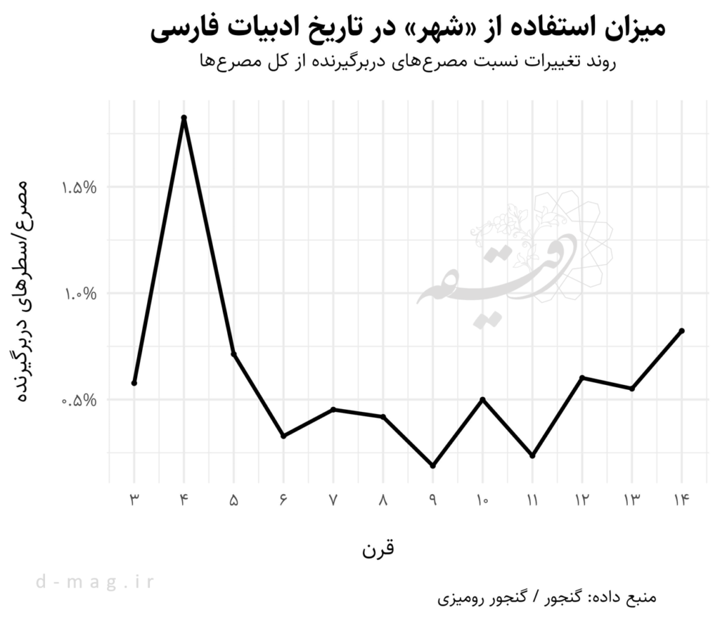 سهم مصرع‌ها و سطرهای دربرگیرنده واژه «وطن» از کل مصرع‌ها و سطرها از قرن چهارم تا قرن دوازدهم همواره روندی تقریبا رو به رشد داشته و به نزدیک ۰.۱۹% می‌رسد و در قرن سیزدهم به‌یکباره به ۰.۰۷% کاهش می‌یابد، اما در قرن چهاردم وطن به فریاد در می‌آید و میزان استفاده از آن در ادبیات به مقدار بی‌سابقه ۰.۲۶% افزایش می‌یابد.