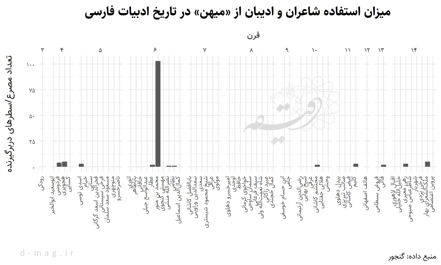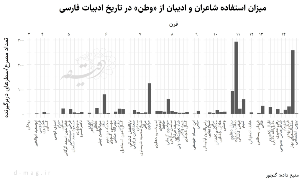 از مجموع ۱ میلیون ۶۰۰ هزار مصرع یا سطری که از بیش از ۸۰ شاعری در منابع گنجور وجود دارد، در بیش از ۱ هزار و ۵۰۰ مورد از واژه «وطن» استفاده شده است. به عبارت دیگر تقریبا از هر ۱۰۰۰ مصرع در ادبیات فارسی یکی به «وطن» اختصاص دارد.