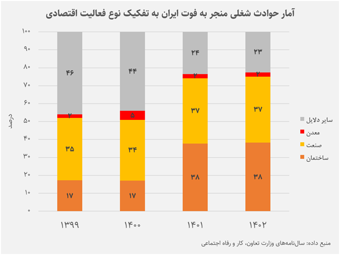 مرگومیر ناشی از حوادث کار در ایران برخلاف روند جهانیِ کاهش تلفات کاری، بر اساس آمار سازمان پزشکی قانونی کشور، در چهارده سال گذشته با افزایش ۷۸% و بر اساس آمارهای سازمان تأمین اجتماعی با افزایش ۵۷۸% روبهرو بوده است.
