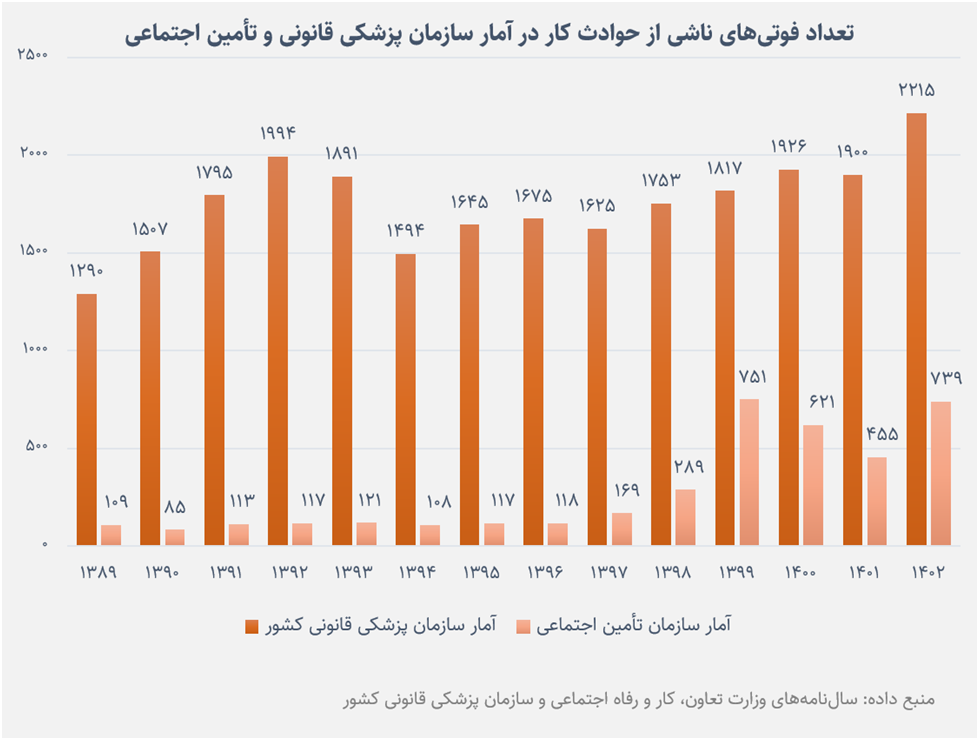 نگاهی به تغییرات آمار فوت ناشی از حوادث کار در [۳]دادههای پزشکی قانونی نشان میدهد از سال ۱۳۹۴ روندی صعودی در پیش گرفته و ۱۴۹۴ مورد در آن سال به ۲۲۱۵ مورد در سال ۱۴۰۲ رسیده است (۴۸% افزایش).