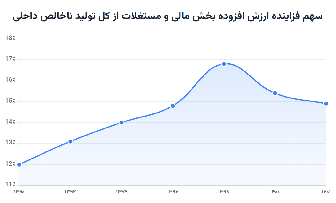 یکی از بهترین شاخص‌ها برای سنجش این پدیده، نسبت ارزش افزوده بخش‌های مالی و مستغلات به کل تولید ناخالص داخلی است. این نسبت به ما می‌گوید چه‌قدر از ثروتی که در اقتصاد ثبت می‌شود، نه از کار و تولید، بلکه از بازی با دارایی‌ها به دست می‌آید. تحلیل داده‌های بانک مرکزی نشان می‌دهد که این سهم از ابتدای دهه ۱۳۹۰ (۱۲٪)، تقریباً به‌طور پیوسته رو به افزایش بوده است. این رشد در فاصله سال‌های ۱۳۹۶ تا ۱۳۹۸ شیب تندتری به خود گرفته و به اوج خود در حدود ۱۷٪ رسیده است. پس از آن، از سال ۱۳۹۹ تا ۱۴۰۱، شاهد کاهش حدوداً ۲ درصدی در این سهم هستیم که می‌تواند ناشی از عواملی مانند ترکیدن حباب در بازارهایی نظیر بورس (در سال ۱۳۹۹) یا احتمالاً رکود نسبی در بازار مسکن پس از جهش‌های قیمتی باشد.