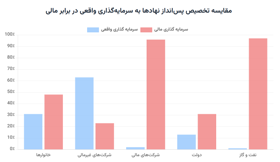 از سوی دیگر، مقایسه شیوه تخصیص پس‌انداز نهادها تصویری تکان‌دهنده‌تر از یک اقتصاد دوپاره را به نمایش می‌گذارند: در حالی که شرکت‌های غیرمالی (بخش مولد اقتصاد) همچنان بیش از ۶۰٪ پس‌انداز خود را به سرمایه‌گذاری واقعی و فیزیکی اختصاص می‌دهند، در سوی دیگر، شرکت‌های مالی و بخش نفت و گاز با تخصیص بیش از ۹۵٪ منابع خود به سرمایه‌گذاری‌های غیرفیزیکی (مالی)، عملاً تمام توان خود را بر سوداگری و فعالیت‌های غیرمولد متمرکز کرده‌اند[۵].