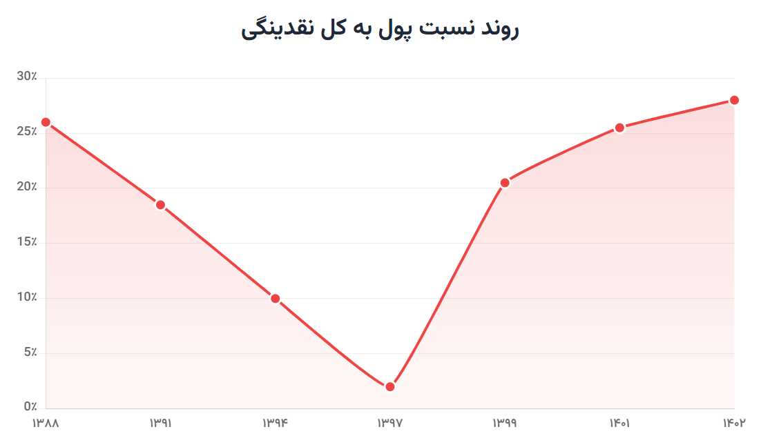 [۷] شاخص نسبت پول به کل نقدینگی[۷] که برای نمایش روند سرمایه‌های سیال به کار رفته، بر اساس آمارهای خلاصه تحولات اقتصادی و پولی بانک مرکزی برای دوره زمانی ۱۳۸۸ تا ۱۴۰۲ محاسبه گردیده است.