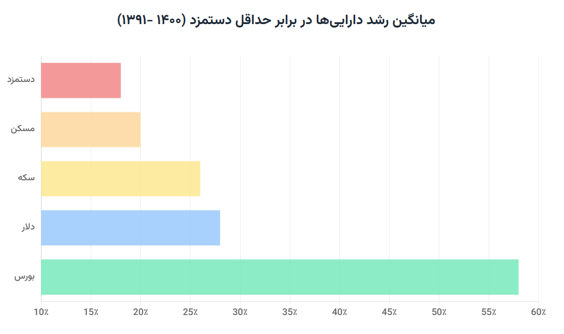 در حالی که حداقل دستمزد طی دهه ۹۰ رشدی در حدود ۸ برابر را تجربه کرد، این میزان در مقابل بازدهی نجومی سایر بازارها ناچیز بود. مسکن تهران بیش از ۱۰ برابر، سکه حدود ۱۲ برابر و دلار نزدیک به ۱۳ برابر رشد کردند. در صدر این مسابقه، شاخص بورس با رشدی بیش از ۵۵ برابر، بازدهی خیره‌کننده‌ای را به ثبت رساند[۱۱]. این شکاف عمیق میان رشد درآمد حاصل از کار و بازدهی بازارهای دارایی نشان می‌دهد درآمد دیگر پاداش تولید ارزش نیست، بلکه جایزه‌ مالکیت، دسترسی به رانت و توانایی قمار بر سر بی‌ثباتی است.
