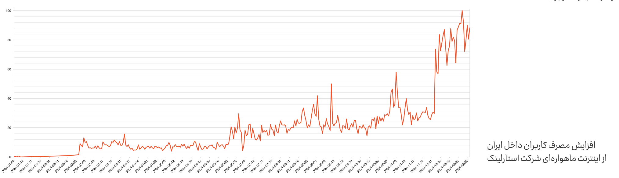 به گزارش روابط عمومی انجمن، بررسیهای کارشناسان کمیسیون اینترنت انجمن تجارت الکترونیک تهران نشان میدهد که روند استفاده از اینترنت استارلینک در یکسال گذشته در ایران افزایشی ۲۰ برابری داشته است؛ این یعنی: