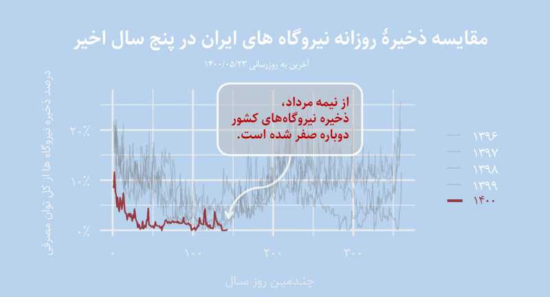 ایران در حال حاضر روزهای اوج مصرف برق در سال را سپری میکند. از نیمه مرداد تا کنون چیزی تحت عنوان «ذخیره تولید» در نیروگاههای کشور باقی نمانده و مقدار آن در بیشتر روزها صفر است. به بیان دیگر در روزهای جاری، خاموشی گسترده در کشور وجود داشته است[۱].