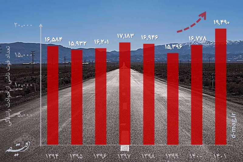 در مهر ۱۴۰۰، چند ماه پس از جان باختن دو خبرنگار محیط زیست در استان آذربایجان غربی، دقیقه تحلیلی درباره آمار کشتههای حوادث رانندگی در ایران منتشر کرد. در آن تحلیل آمار فوت ناشی از تصادف در دادههای سازمان پزشکی قانونی بررسی و استانهای حادثهخیز و استانهایی که آمار کشتههای تصادف در آنها بیشتر از مقدار مورد انتظار بوده شناسایی و گزارش شدند. نکته دیگری که در این تحلیل به آن اشاره شد «هشدار زیر سایه کرونا» بود. در سال ۹۸ و ۹۹ آمار کشتههای تصادف کاهش یافته بود اما بیان شد که این تغییر تنها تحت تاثیر کرونا رخ داده است. روند نزولی آمار سوانح جادهای با شیوع کرونا متوقف شده و تغییر رفتار آن زیر سایه کرونا به راحتی قابل مشاهده نبود. بر همین اساس، پیشبینی شد که با عادی شدن وضعیت، آمار کشتههای تصادف رانندگی در ایران حتی از مقداری قبلی آن نیز بیشتر خواهد شد. حال تحلیل دادههای پزشکی قانونی در سال ۱۴۰۰ و ۱۴۰۱ نشان میدهد که این پیشبینی درست بوده چراکه آمار کشتههای تصادف در ایران در سال ۱۴۰۱ به بیش از ۱۹ هزار نفر رسیده است. ویرایش دوم این مقاله به همین مناسبت با دادههای جدید بهروزشده تهیه شده است. متن کامل آن را در ادامه مطالعه کنید.