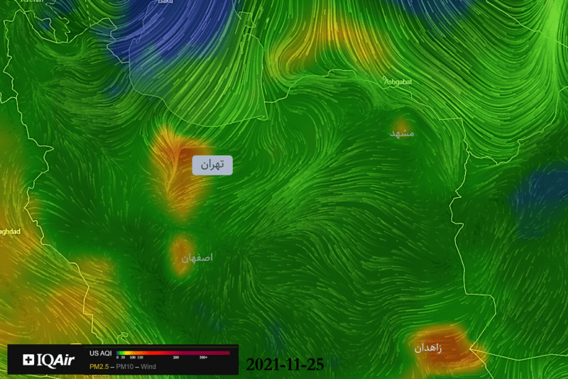 دادههای این جدول از وبسایت IQAir [۳] استخراج شده است. هرچند که این وبسایت داده های خود را از ایستگاههای زمینی نصب شده در تهران استخراج میکند. این ایستگاهها توسط شهرداری تهران و سازمان محیط زیست نصب و نگهداری میشوند. نکته نگران کننده در این جدول مقادیر چند برابر بیش از توصیههای بین المللی ذرات معلق در هوای تهران است.